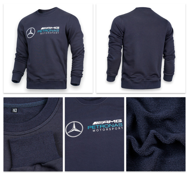 Виріб поєднується з олімпійки або курткою, джинсами, брюками, спортивними штанами, видовженими бриджами. Прикрашає світшот масивна напис на грудях, виконана в 3-х кольорах: синьому, сірому, білому. Також, є логотип автомобільного бренду MERCEDES.
