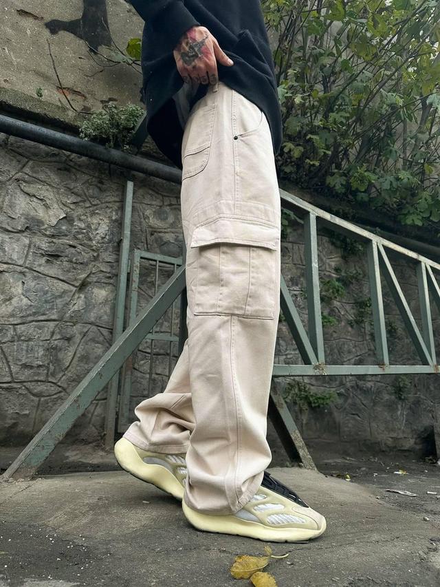 Чоловічі широкі джинси карго, бежеві, вуличний стиль, з кишенями
