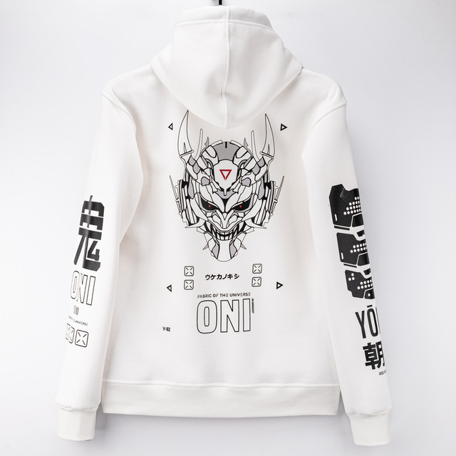 На спині розміщено великий принт із зображенням кібер-демона Оні — символу сили, індивідуальності та духу японської культури. Графічні елементи та ієрогліфи на рукавах і грудях додають моделі характеру та впізнаваного стилю бренду Fabric of the Universe.