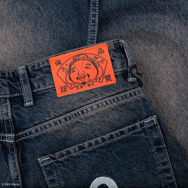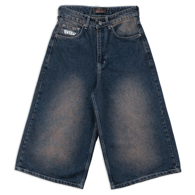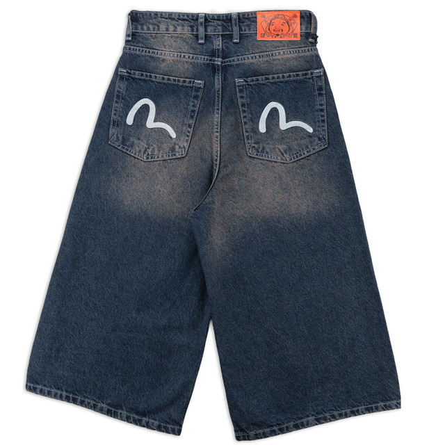 Чоловічі широкі джинсові шорти EVISU у темно-синьому кольорі з ефектом потертості — вибір для поціновувачів Y2K, скейтерського та вуличного стилю. Модель має фірмову вишивку на задніх кишенях, характерний оверсайз фасон у стилі baggy та фірмову бірку бренду. Ідеально підходять для створення комфортного streetwear образу.