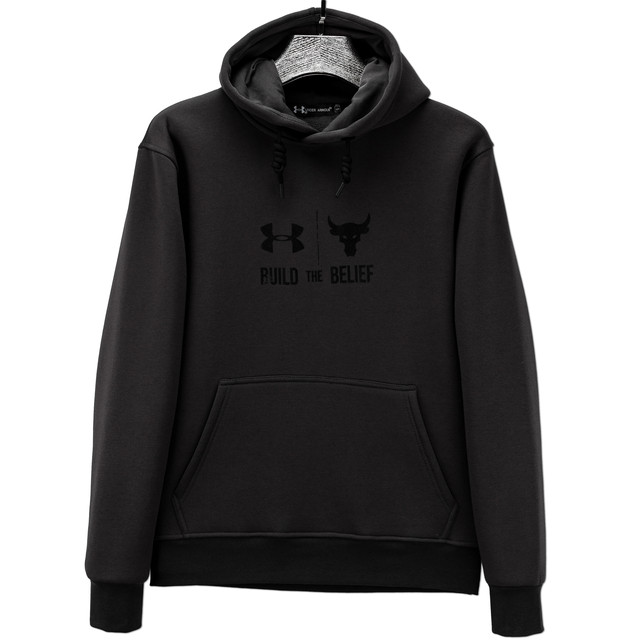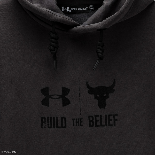 На грудях розміщений фірмовий принт Under Armour × Project Rock із написом “Build The Belief”, що символізує силу, витривалість і мотивацію.